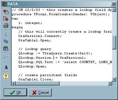 If the table is in edit mode, the dialogue will be displayed as above, with an OK button to confirm changes made to the text. Modifications made to the memo text will be written back to the field. If the table is in read-only mode, the dialogue will be displayed without an OK button, and editing of the memo text will be disabled.