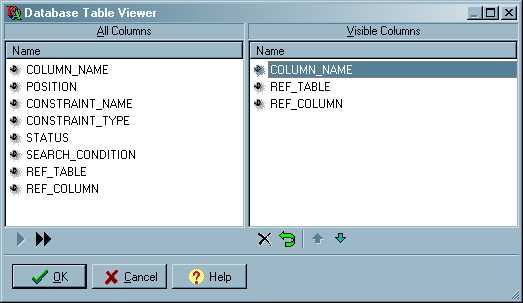 The list on the left ('All Columns) shows the columns in the order defined in the underlying table. The list on the right ('Visible Columns') shows the columns in the order in which they will be displayed.