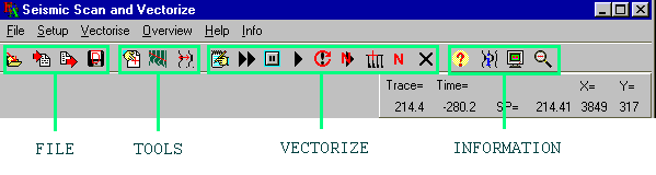This panel at the top right of the main form, below the main toolbar, shows the position of the cursor on the main display both in X-Y pixel coordinates on the input raster file and in trace, shotpoint and time position in the output trace file.